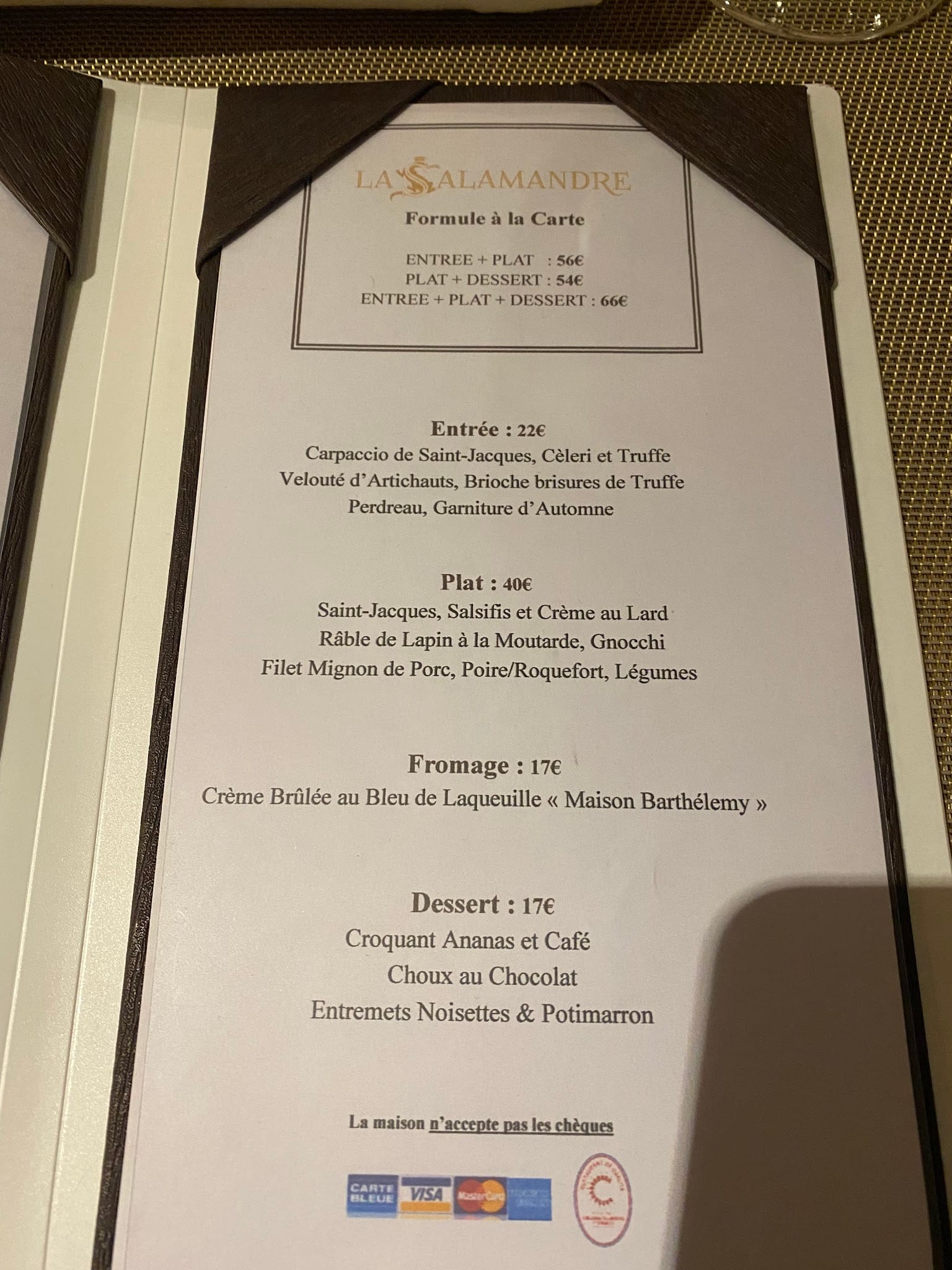La Salamandre revisite avec finesse les grands classiques de la cuisine traditionnelle française, proposant des plats savoureux élaborés uniquement à partir de produits frais et de saison. La majorité des viandes est issue de filières françaises, les poissons proviennent des côtes atlantiques, et les légumes sont en grande partie achetés localement afin de soutenir une démarche durable. Tout, y compris les desserts, est fait maison.