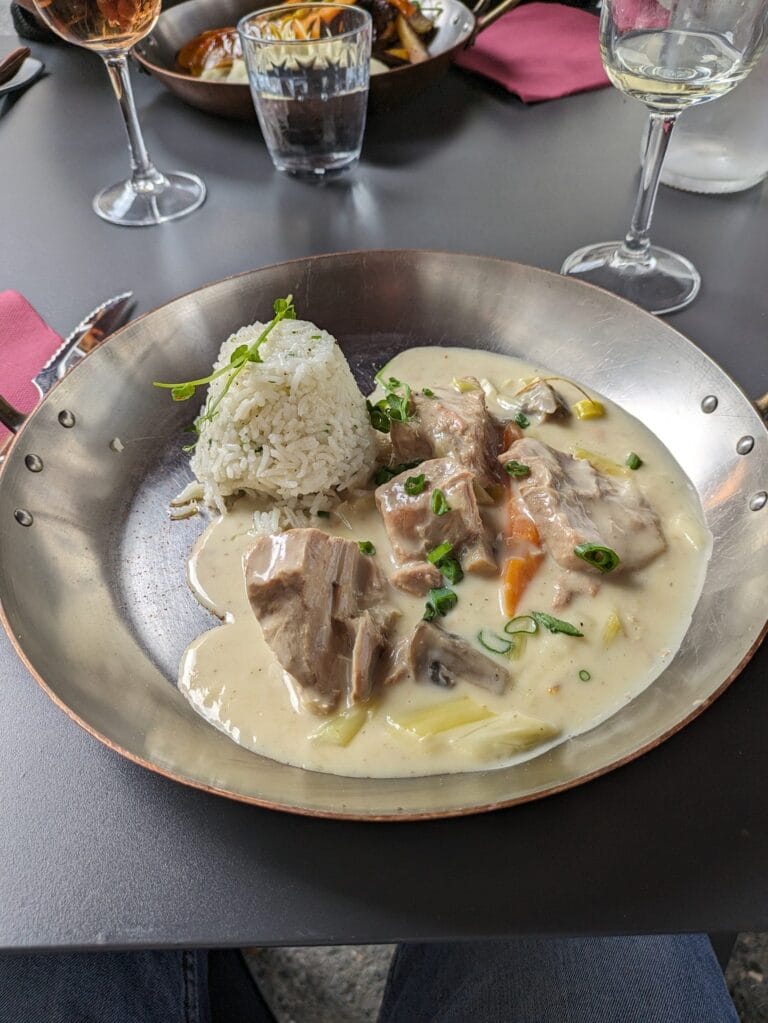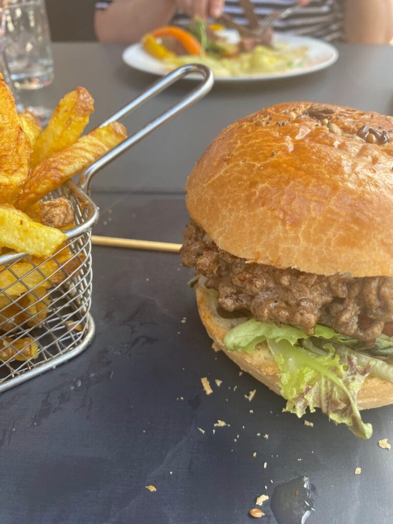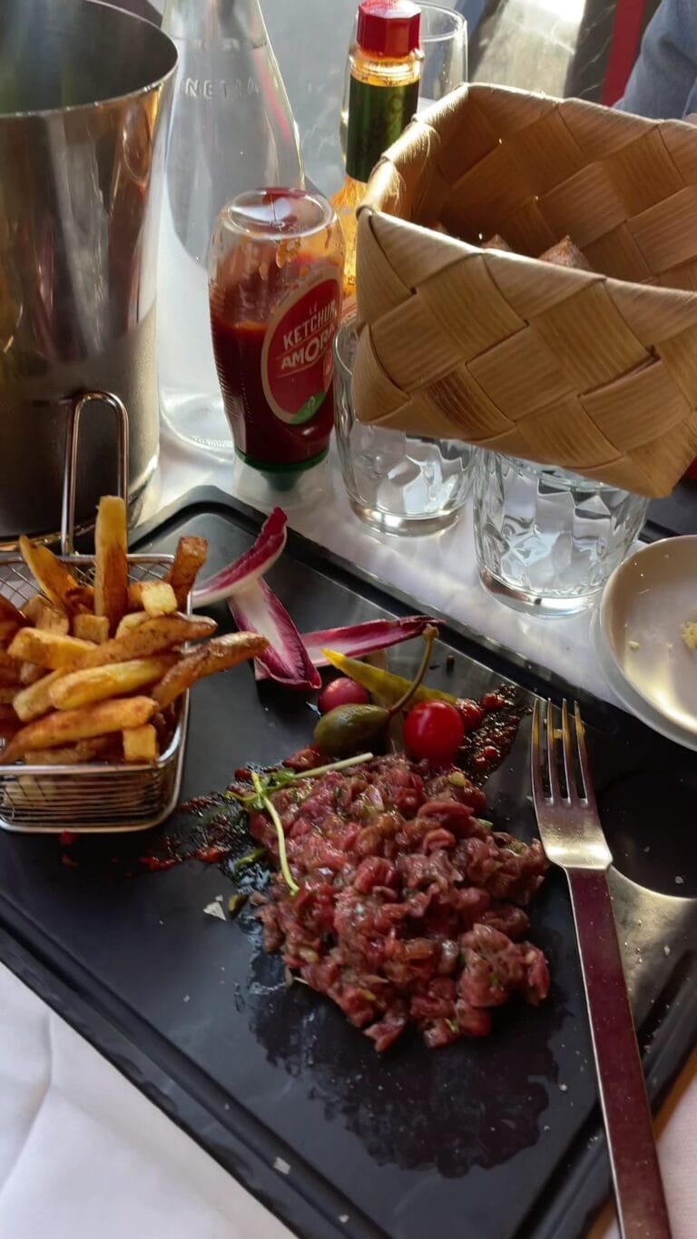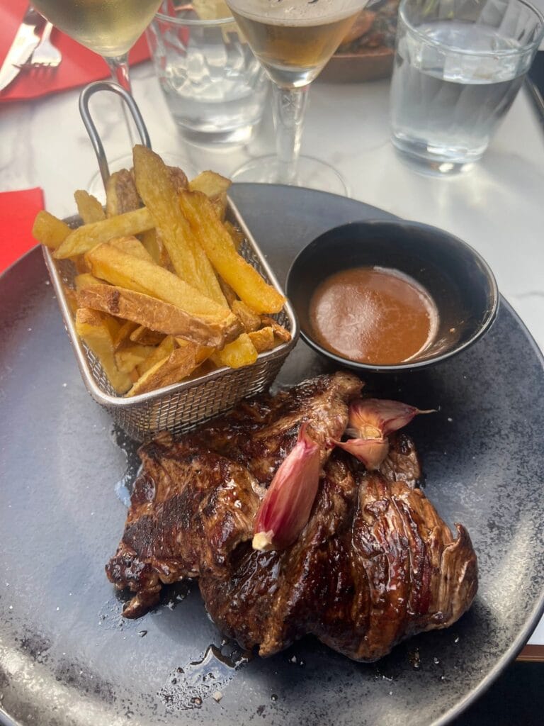 The restaurant features a traditional French bistro cuisine prepared with mainly organic, local and fresh produce. The chef offers house specialties such as beef cheek, Charolais entrecôte, knife-cut tartare, prime rib for two, and a "retour de pêche" (return of the catch) depending on what's available. Gourmet slates to share and homemade desserts complete a carefully prepared menu.